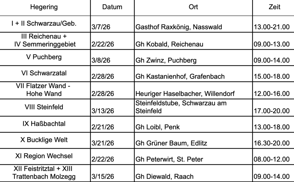 Hegeschautermine 2026 Datum: 09.01.2026 Termin teilen: Hier sind alle Hegeschautermine von 2026 aufgelistet: